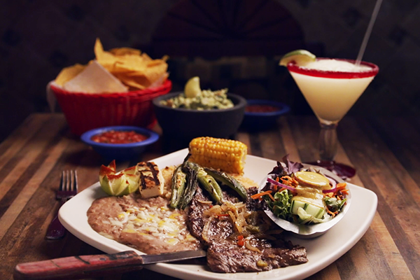 Chargrilled skirt steak topped with grilled cambray onions and served with rice, lettuce, corn on the cob, avocado slices and queso fresco.