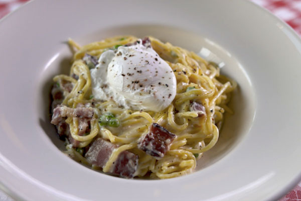 You can’t have Italian without the carbs or carbonara and this dish masters both. Thick cut Nueske’s bacon is sautéed with snow peas and Chitarra pasta in a thick cream sauce and topped with a poached egg.