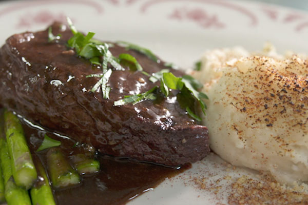 In-house butchered steak is grilled to perfection and served with garlic mashed potatoes and grilled asparagus. It is then topped with a red wine steak jus making each bite drip in flavor.