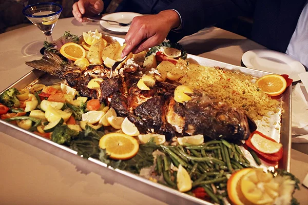 Incredible, whole broiled fish are available in multiple varieties – pictured here is the Lavraki, a Greek delicacy.