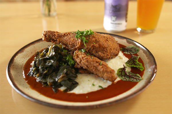 Perfectly breaded and fried, this evening’s special featured a fried chicken on a bed of grits and pooled with hot sauce!