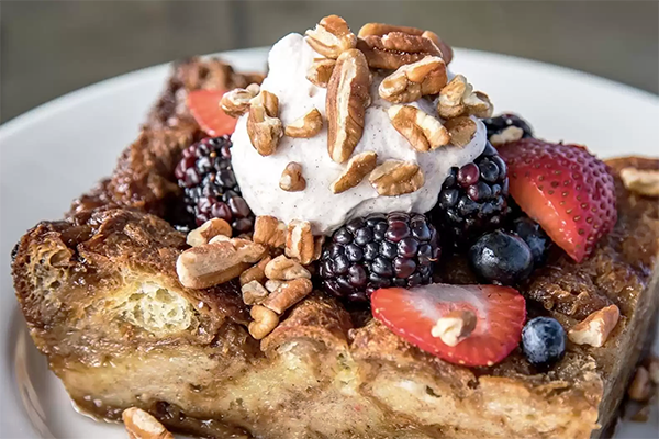 Petit Chou is perhaps best known for their Liège Waffles: Belgian waffles with seasonal fruits and pecans, topped with Vermont maple syrup and an addictive cinnamon-vanilla whipped cream. On a similar note is the French Toast Crème Brûlée Combier, AKA croissant French toast (be careful not to drool on your screen). Some of the more savory items include the Eggs Benedict (topped with pancetta, arugula, and diced tomatoes), Biscuits and (chicken sausage) Gravy, and the French bistro favorite Croque Monsieur. Not to mention, they start serving lunch at 11:00 AM.